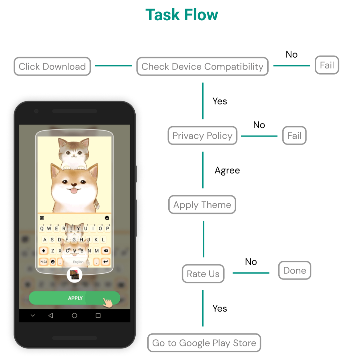 User Scenarios: Meet Mia, who wants to download a cute kitty keyboard theme. After browsing thru the app, she finds one that she likes the most and decides to download it on her phone. The downloading process is quick and easy and Mia is very happy about her new keyboard theme. At this time a window pop-up and asking her to rate the app.